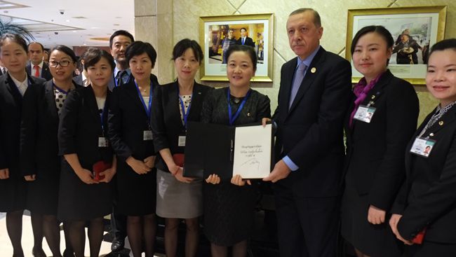 9月5日下午,土耳其總統(tǒng)埃爾多安離開酒店前,對(duì)杭州維景的服務(wù)深表滿意,在衆(zhòng)多媒體的關(guān)注下,爲(wèi)杭州維景簽名留念,幷與管理人員合影,感謝杭州維景提供的溫馨、細(xì)緻、周到的服務(wù),同時(shí)盛情邀請(qǐng)酒店員工去土耳其觀光遊覽。