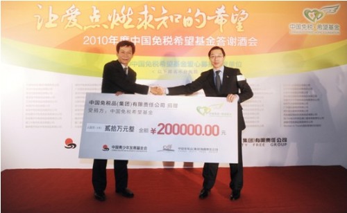中國青少年發(fā)展基會秘書長涂猛先生致辭。中國免稅品(集團)有限責任公司副總裁陳國強先生代表中國免稅希望基金致了答謝詞。中免集團全體領導上臺,向 “2010年度中國免稅希望基金愛心募捐榮譽單位”頒發(fā)獎牌。隨后,為了表彰中免集團發(fā)起并成立僅僅三年的“中國免稅希望基金”為中國公益事業(yè)做出的突出 貢獻,中國青少年發(fā)展基金會把特別設立的“希望工程20年杰出公益伙伴”獎頒發(fā)給中免集團。