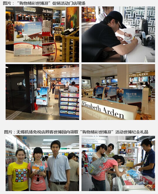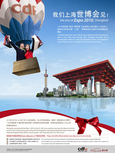 中免集團(tuán)利用2010年上海世博會(huì)所帶來(lái)的商機(jī),聯(lián)合集團(tuán)下屬零售門(mén)店及品牌供應(yīng)商進(jìn)行了以“購(gòu)物精彩世博游”為主題的聯(lián)合促銷(xiāo)活動(dòng)。活動(dòng)歷時(shí)4個(gè)月,從2010年5月1日開(kāi)始,并于2010年8月31日精彩落幕。