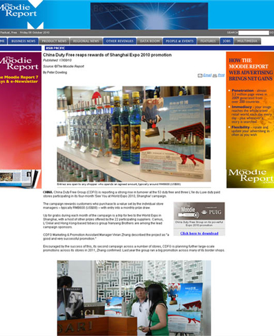 “精彩購(gòu)物世博游”促銷(xiāo)活動(dòng)受到全球免稅權(quán)威雜志穆迪報(bào)告(The Moddie Report)關(guān)注,并以專(zhuān)訪形式在慕迪報(bào)告網(wǎng)站和雜志上刊登了專(zhuān)題報(bào)道。