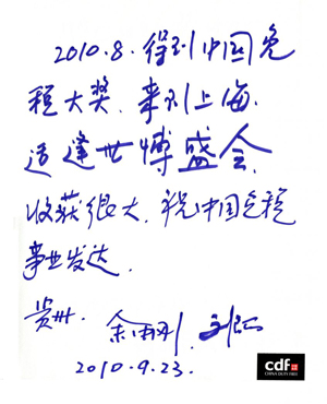 “接到中獎(jiǎng)通知電話的時(shí)候有些以外了,有些不敢相信,不過(guò)在聽(tīng)到工作人員的詳細(xì)介紹后就覺(jué)得很開(kāi)心自己能夠獲得特等獎(jiǎng),隨后又收到了貴公司寄給我的獲獎(jiǎng)通知及合同還有世博會(huì)門(mén)票,就覺(jué)得做的很細(xì)致,也完全相信了我確實(shí)是這么幸運(yùn)了,非常高興。”