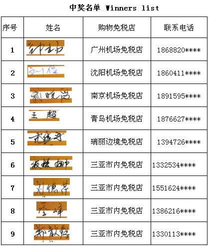 中免集團發(fā)起的“離島免稅周年慶 沖刺倫敦觀奧運”大型促銷活動在中免集團旗下19家免稅門店開展,活動現(xiàn)已結(jié)束,其中“倫敦奧運觀賽之旅”中獎顧客已在北京市方圓公證處公證人員嚴格監(jiān)督公證下抽取產(chǎn)生,中獎顧客名單發(fā)布如下:
