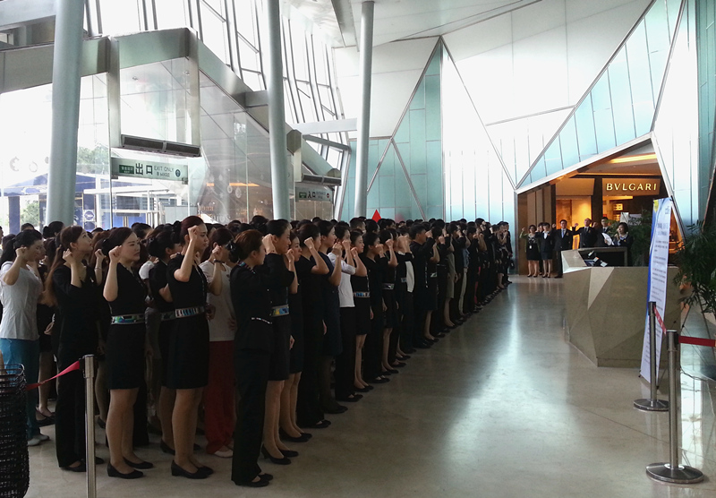 “我宣誓,我們將以客戶為中心,以市場為導(dǎo)向,不怕困難、專業(yè)高效、團(tuán)隊合作、勇于創(chuàng)新,用誠信經(jīng)營贏得顧客的信任,用優(yōu)質(zhì)服務(wù)換取顧客的滿意。”洪亮的聲音在三亞市內(nèi)免稅店內(nèi)回響,宣誓著承諾和責(zé)任。