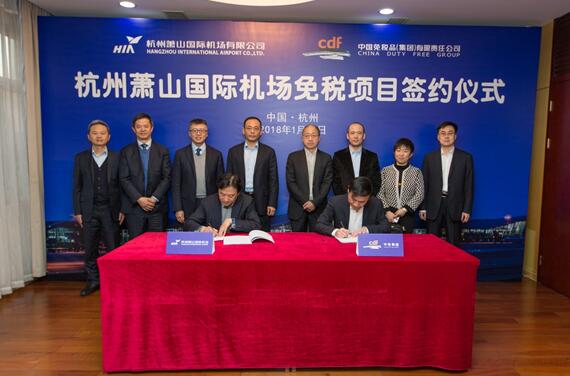 2018年1月11日,杭州蕭山國(guó)際機(jī)場(chǎng)免稅項(xiàng)目簽約儀式在機(jī)場(chǎng)綜合辦公樓舉行。中國(guó)免稅品(集團(tuán))有限責(zé)任公司董事長(zhǎng)陳建山、副總經(jīng)理王軒,杭州蕭山國(guó)際機(jī)場(chǎng)有限公司董事長(zhǎng)王敏、總經(jīng)理鄭向平以及相關(guān)人員出席了簽約儀式。