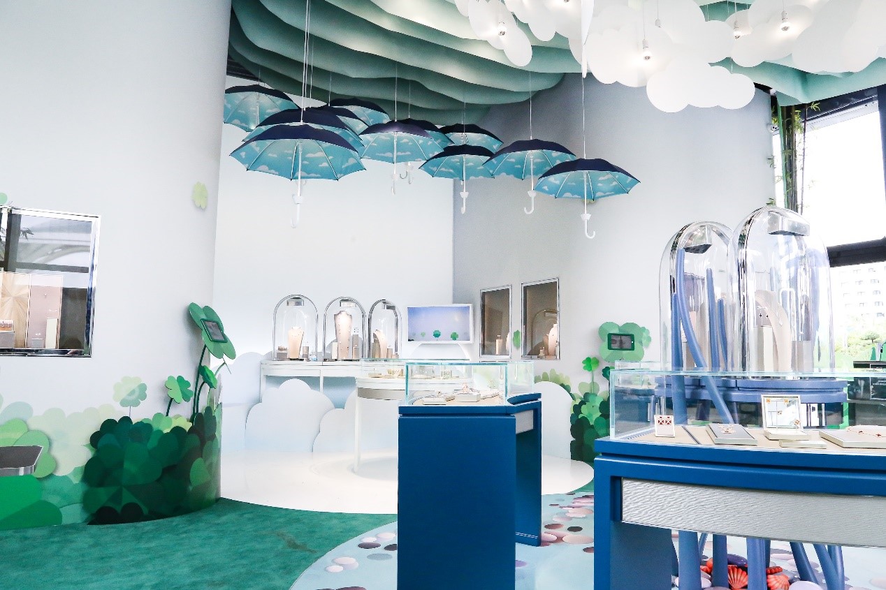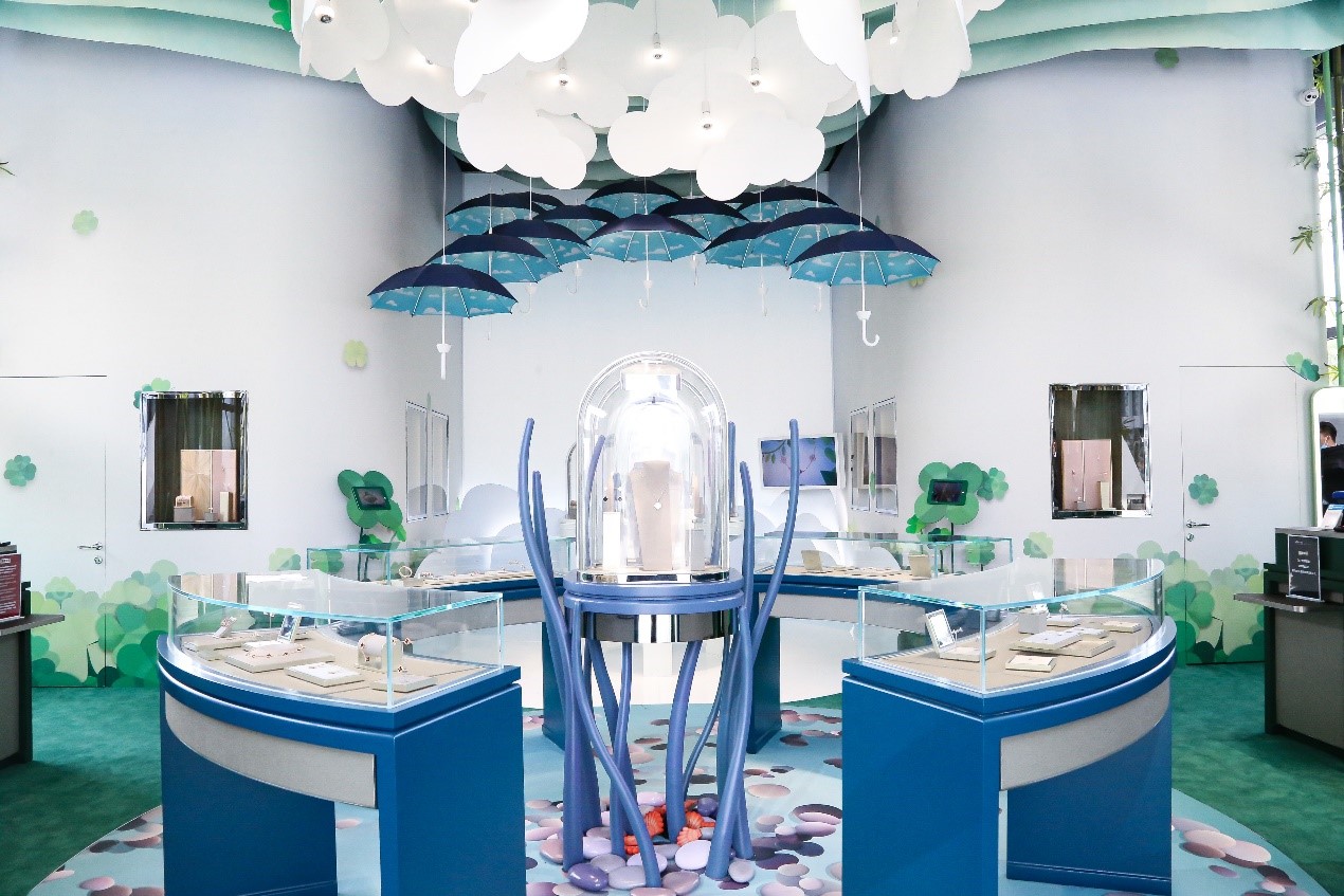 Van Cleef & Arpels梵克雅寶“Alhambra幸運(yùn)花園”免稅限時(shí)精品店位于三亞國(guó)際免稅城后廣場(chǎng)。世家要員雅克·雅寶Jacques Arpels常言道:“心懷幸運(yùn)之愿,方能成為幸運(yùn)之士?!毙疫\(yùn)是梵克雅寶一直以來(lái)十分珍視的價(jià)值,更是其創(chuàng)意靈感的泉源之一,因此限時(shí)精品店內(nèi)部設(shè)計(jì)以世家標(biāo)志性四葉幸運(yùn)圖案為主題,以延續(xù)這珍貴價(jià)值。進(jìn)店后,首先映入訪客眼簾的將是Burcu & Geoffrey 這對(duì)法國(guó)和土耳其的導(dǎo)演拍檔為Alhambra 特別創(chuàng)作的四葉圖騰造型蝴蝶沿途散播幸運(yùn)的種子,帶領(lǐng)游客穿梭在幸運(yùn)花園中,引領(lǐng)大眾一同探索夢(mèng)幻迷人的Alhambra 幸運(yùn)花園, 為游客營(yíng)造出一種舒適愉快的珠寶欣賞空間。