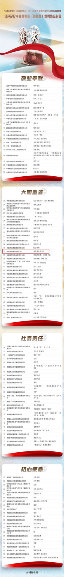 日前,“大國(guó)頂梁柱 永遠(yuǎn)跟黨走”中央企業(yè)慶祝建黨百年百部微電影(微視頻)展映發(fā)布活動(dòng)在京舉辦。活動(dòng)現(xiàn)場(chǎng)發(fā)布了初心使命、大國(guó)重器、敬業(yè)奉獻(xiàn)、社會(huì)責(zé)任等四個(gè)主題100部?jī)?yōu)秀作品。