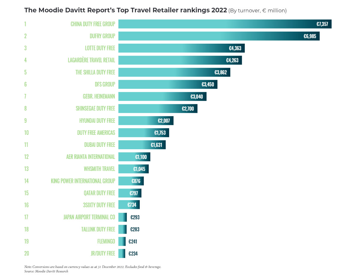 2023年8月28日,全球旅游零售行業(yè)權(quán)威媒體《穆迪達(dá)維特免稅報(bào)告》(The Moodie Davitt Report)發(fā)布《全球領(lǐng)先旅游零售商報(bào)告》,對(duì)過去一年來全球前20名旅游零售商展開了跟蹤評(píng)估。報(bào)告顯示,根據(jù)2022年?duì)I業(yè)額統(tǒng)計(jì),中免集團(tuán)連續(xù)第三年在全球頂級(jí)旅游零售商中保持領(lǐng)先地位,成為2022年全球最大旅游零售商。