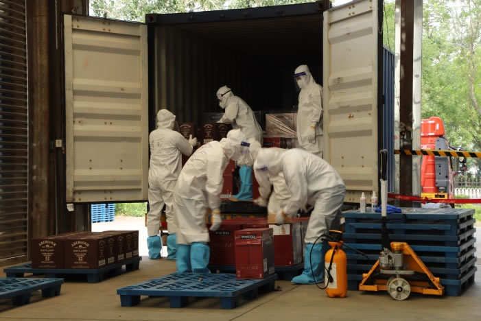 近日,又一批海運(yùn)集裝箱抵達(dá)物流基地。首都機(jī)場聯(lián)合黨支部成立的黨員先鋒隊(duì)配合執(zhí)行消殺卸貨工作。大家先對集裝箱進(jìn)行徹底無死角的全面消殺,隨后將貨物分批搬運(yùn)、拆箱,對貨物單個(gè)最小包裝物進(jìn)行逐一消殺,最后再統(tǒng)一裝箱。歷時(shí)5個(gè)小時(shí),將全部貨物消殺完畢,為后續(xù)工作建立了第一道安全保障。