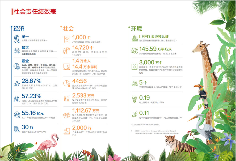 7月18日,中國(guó)旅游集團(tuán)中免股份有限公司以中英文雙語的形式,披露了公司上市以來的首份ESG報(bào)告——《2021年度環(huán)境、社會(huì)及管治報(bào)告》。公司以不斷滿足消費(fèi)者日益增長(zhǎng)的對(duì)美好生活的追求為使命,在推動(dòng)公司高質(zhì)量發(fā)展的同時(shí),積極以行業(yè)道德行為和成果貢獻(xiàn)回饋社會(huì),成績(jī)斐然。
