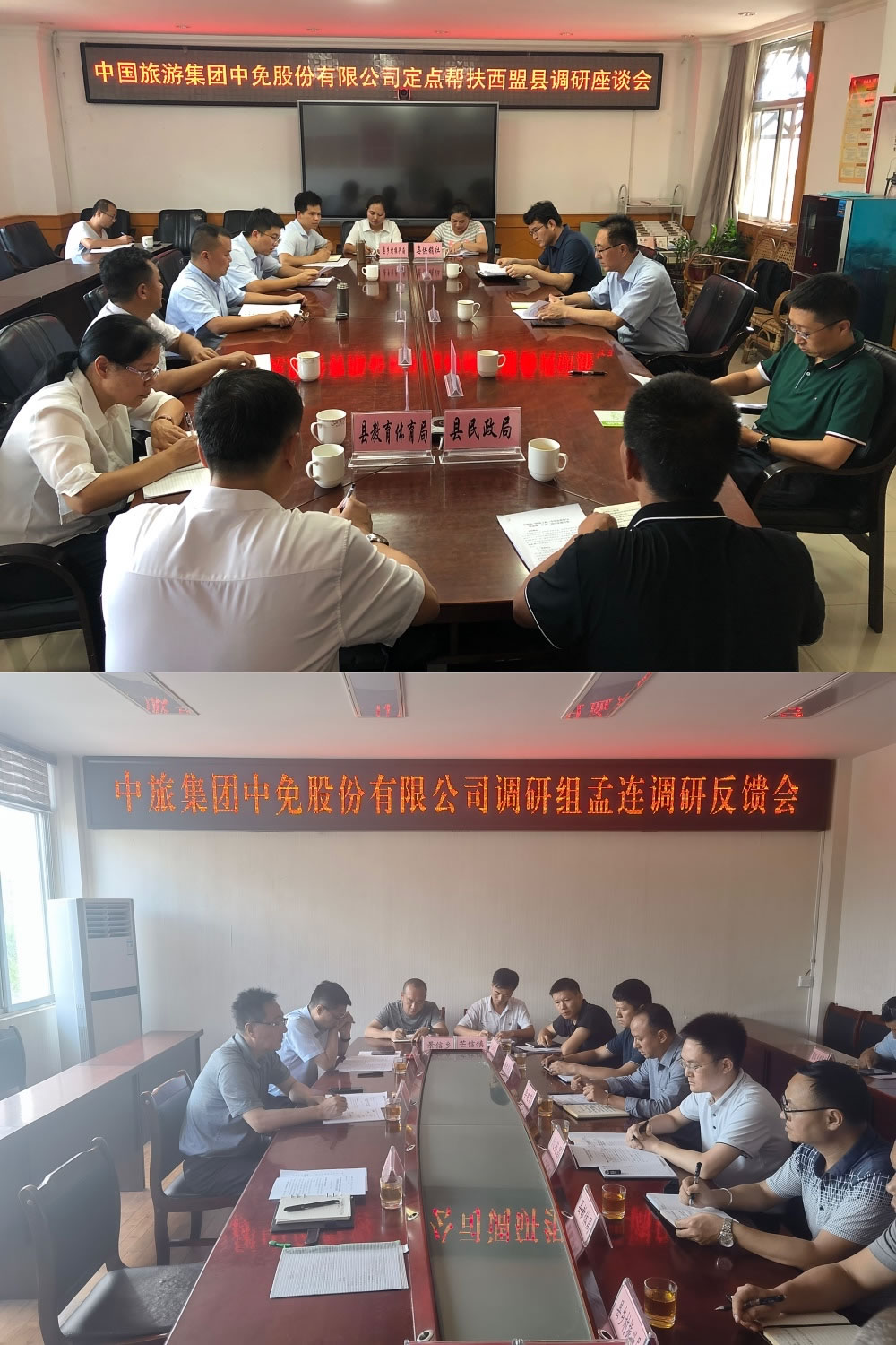 2021年7月6日至9日,中旅免稅黨委書記、董事長彭輝、黨委副書記王月浩一行赴云南省孟連縣、西盟縣開展幫扶工作調(diào)研,重點調(diào)研中旅免稅2021年擬在兩個縣開展的旅游主業(yè)幫扶、特色產(chǎn)業(yè)幫扶、教育幫扶等相關(guān)工作,并召開座談會,就2021年孟連縣、西盟縣持續(xù)抓好鞏固脫貧攻堅成果接續(xù)鄉(xiāng)村振興工作與兩縣縣委、縣政府進行深入交流。
