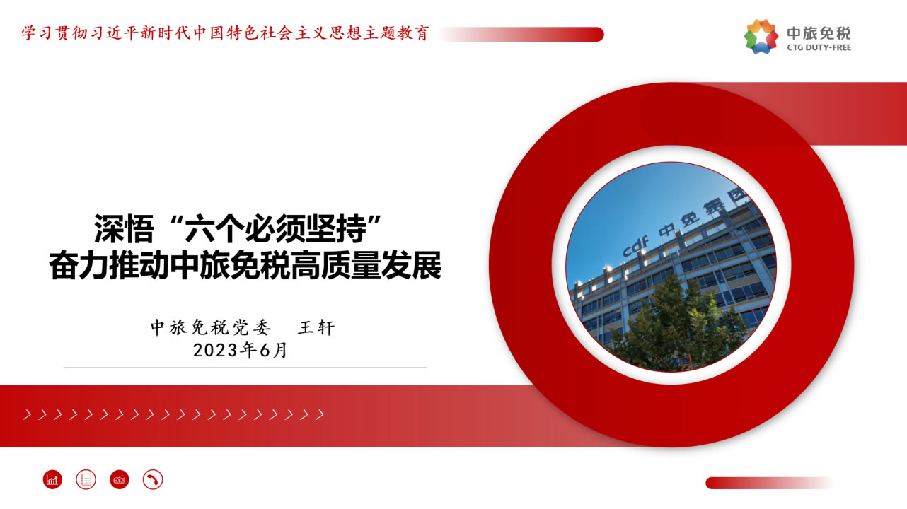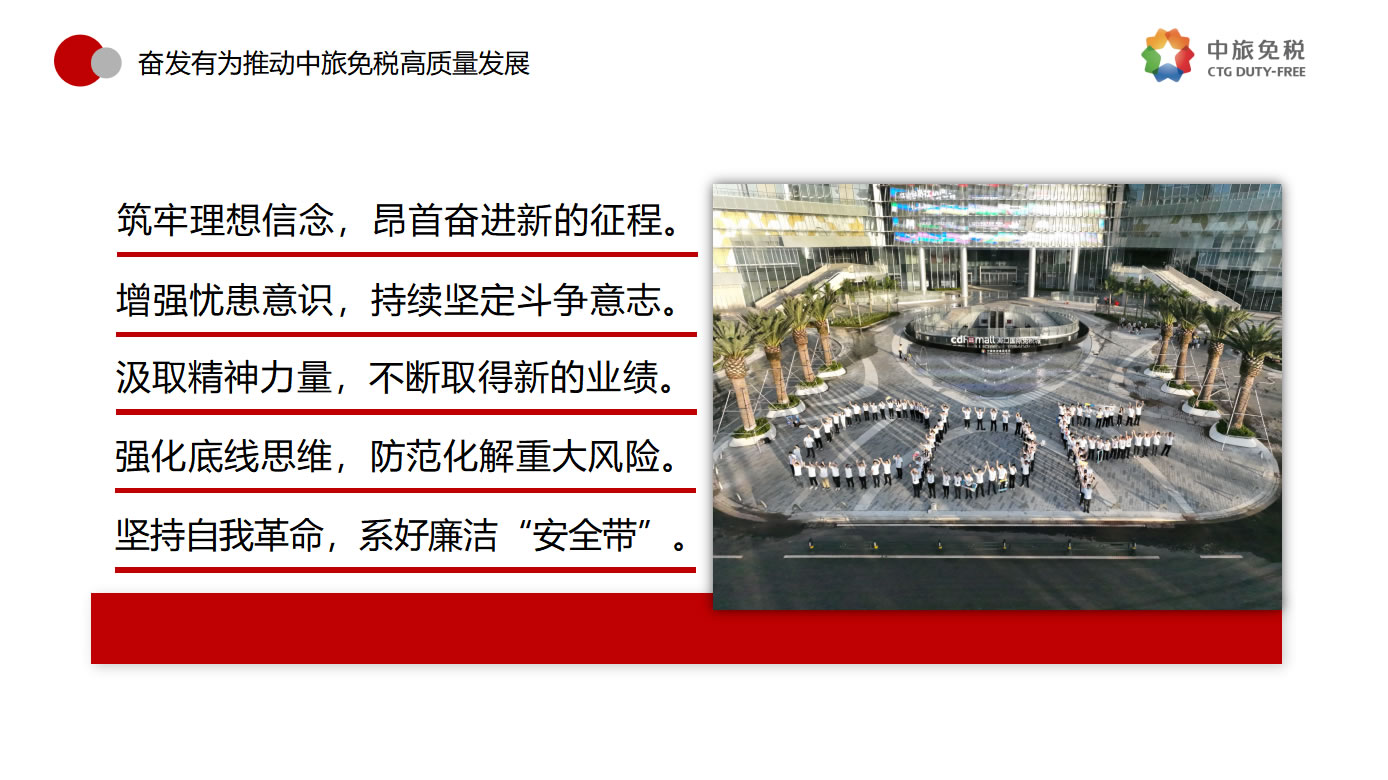 一是筑牢理想信念,昂首奮進新的征程。要堅決貫徹落實總書記指示,優(yōu)化發(fā)展方式,注重發(fā)展品質(zhì),追求質(zhì)量更優(yōu)、效益更好、效率更高的可持續(xù)增長,做強做優(yōu)公司核心競爭優(yōu)勢,全面提升公司經(jīng)營發(fā)展的系統(tǒng)能力。二是增強憂患意識,持續(xù)堅定斗爭意志。要進一步強化危機意識、憂患意識,主動擔責、主動擔難、主動擔險,以強烈的使命感和責任感,統(tǒng)一思想、統(tǒng)一意志、統(tǒng)一行動。三是汲取精神力量,不斷取得新的業(yè)績。要以“紅色引擎 免稅先鋒”“海棠精神”“紅帆工程”等黨建品牌活動為切入點,進一步提升基層黨組織的組織力,通過共建活動平臺、分享工作資源、交流工作經(jīng)驗、解決實際問題等途徑,實現(xiàn)黨的建設與業(yè)務發(fā)展建設良性互動,以深入推進全面從嚴治黨引領(lǐng)保障高質(zhì)量發(fā)展。四是強化底線思維,防范化解重大風險。要深刻領(lǐng)會習近平總書記關(guān)于強化底線思維,防范化解重大風險的重要論述,充分認清當前面臨的形勢任務,系統(tǒng)梳理查找存在的突出風險問題,自覺從習近平新時代中國特色社會主義思想中找到破解矛盾問題的鑰匙,努力在新思想指引下探索推動高質(zhì)量發(fā)展的路徑。五是堅持自我革命,系好廉潔的“安全帶”。要繼續(xù)發(fā)揚自我革命精神,縱深推進黨風廉政建設和反腐敗斗爭,一體推進“不敢腐、不能腐、不想腐”,圍繞財經(jīng)領(lǐng)域?qū)m椪蔚戎攸c問題、緊盯海南地區(qū)所屬的重點企業(yè)和重點項目,以及防范離島免稅“套代購”、傳統(tǒng)渠道免稅店經(jīng)營風險等重點領(lǐng)域和巡視整改等重點工作,深化標本兼治、系統(tǒng)治理,以新時代廉潔文化建設,涵養(yǎng)求真務實、團結(jié)奮斗的中免風貌。